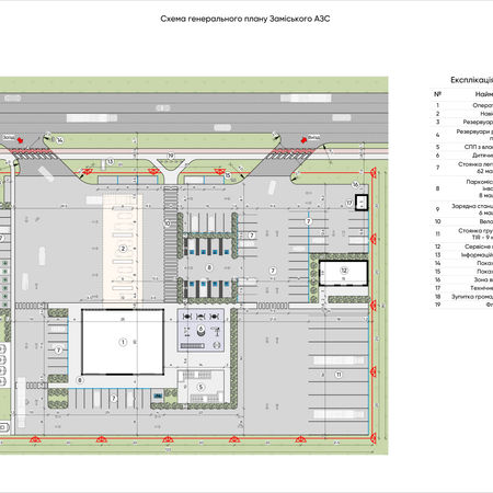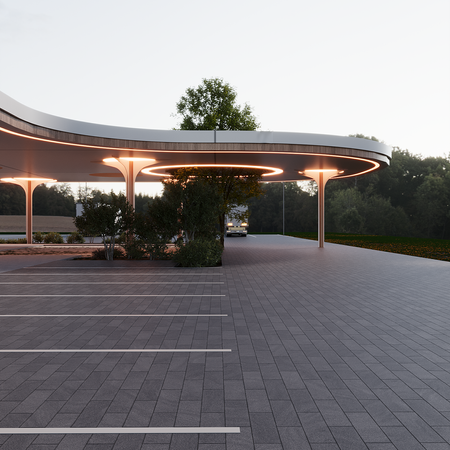 Концепт нової генерації заміських АЗК наша команда сформувала як альтернативний зручний простір в дорозі. Довгу динамічну дорогу ми заміняємо на ніжні, скруглені і спокійні форми та образи нового заміського комплексу АЗК. Консолі покрівлі формують впізнаваний образ, котрий видно здалеку, але в якому максимально комфортно перепочити. Основна будівля формується як легкий засклений блок, інтегрований в озеленену територію навколо та працює як новий локальний центр за містом. Все створено для комфортного відпочинку, роботи та зустрічей.