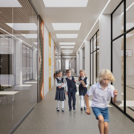 Новий корпус ліцею запроектований на ділянці існуючого ліцею №80 за адресою: вул. Героїв Крут 27, у м. Львів. Ділянка, на якій вдалося розмістити нову будівлю ліцею, має складний рельєф, від головного входу вздовж вул. В. Стуса рельєф має перепад більше 6 метрів. Для занять на свіжому повітрі в проекті передбачено універсальний спортивний майданчик, який розміщений на півночі від нової будівлі ліцею. Вздовж двох сторін майданчика запроектовані трибуни для глядачів. В будівлі ліцею запроектовано амфітеатр, який сполучає поверхи на відмітці 3.600 та 7.500 та освітлюється зенітними ліхтарями. Для занять спортом у школі передбачено спортивний зал та басейн довжиною 25 метрів.