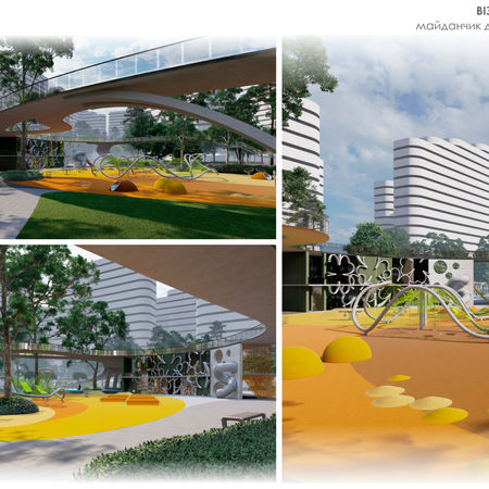 Під час створення концепції ми керувалися сучасними підходами до організації житлового простору, метою яких є досягнення балансу між розвиненою транспортною інфраструктурою, зеленими зонами, водними елементами та просторами для соціальної взаємодії. Запропоновані рішення враховують потреби різних категорій мешканців, незалежно від віку, статі чи індивідуальних особливостей, створюючи універсальний та доступний простір для комфортного життя. Центральний елемент - парк Парк є основним місцем дозвілля та відпочинку, що поєднує в собі: · Зони тихого відпочинку - місця для релаксу серед природи. · Дитячі майданчики - обладнані відповідно до вікових груп. · Воркаут-зони - сучасні спортивні комплекси для активного способу життя. · Багатофункціональні павільйони - простори для дорослих і дітей, обладнані сучасними зручностями. · Майданчики для вигулу собак - спеціально облаштовані місця для тренування та відпочинку домашніх улюбленців. · Гастрономічні локації - три стилізовані ресторани з кухнями на вибір: українською, середземноморською та східною.