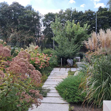 На цій території організовано під’їзди та підходи до споруди офісного центру, які композиційно виділені вздовж вулиці  домінантами - ефектними озелененими ділянками, створено автостоянку на 70 автомобілів, яку обрамляє зелена полоса насаджень, оздоблено рослинами світлові колодязі підземного паркінгу та побудовані в’їзди до нього.