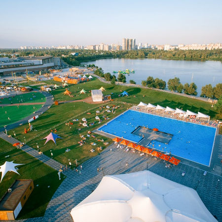 Sky Family Park — це сезонний розважальний комплекс на лівому березі Києва, який поєднує зону для відпочинку біля води, басейн, фуд-корт, сцену для концертів та спортивні майданчики. Простір орієнтований на сімейний відпочинок, фестивалі та події просто неба, з видом на Дніпро та міський пейзаж.
