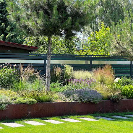 Перепад по висоті обіграний ступеням в газоні та клумбами- підпірними стінками а в якості бордюру ми використали сталь, яку потім обробили для надання ефекту Cor-Ten. З цього ж матеріалу виготовлені клумби.