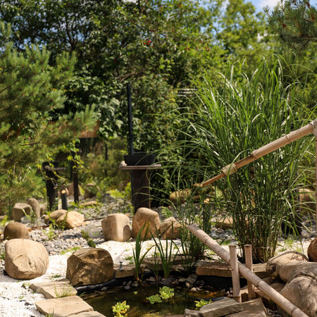 Сад в японському стилі, з поєднанням українських автентичних статуй.