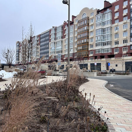 Метою проєкту є формування гармонійного, комфортного та функціонального міського середовища, у якому природна естетика інтегрується в архітектурну композицію житлового комплексу. Просторова організація Ключовим елементом є центральна алея, яка виконує функції: – зеленого коридору з зонами відпочинку, – сервісного осередку із зарядними станціями для електромобілів та комерційними закладами, – пішохідного променаду. Зони відпочинку інтегруються у структуру простору завдяки посадці рослин масивами в підпірних стінах, що створюють ефект камерності, приватності та візуального розмежування. Для формування вертикального акценту передбачено висадку дерев у спеціальних бетонних посадкових конструкціях та великих декоративних кашпо, що водночас підкреслюють сучасний стиль проєкту. Рослинний асортимент До озеленення використані рослини як українського, так і імпортного походження. Верхній ярус формують дерева з виразною сезонною декоративністю, підібрані з урахуванням комбінації зміни кольору листя протягом року. Середній та нижній ярус складають кущі й багаторічники в нейтральній кольоровій гамі, що гармонійно поєднується з архітектурним стилем комплексу: світлим мощенням, натуральним пісковиком в оздобленні підпірних стін та світлими фасадами будівель.