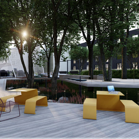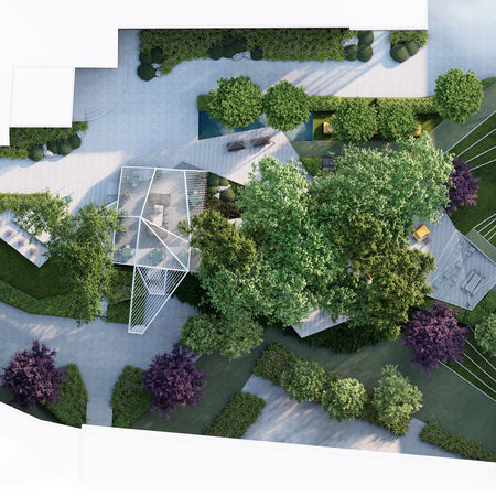 Основна задача проєкту «Gloria Business Garden» полягала у трансформації ревіталізованої промислової зони в зелений smart-простір, що відповідає принципам стійкого та комфортного середовища. Ми інтегрували концепцію «Back to Nature», поєднавши її з практичністю та функціональністю. Ключові рішення в організації простору: · Гібридні зелені зони - простори, що одночасно слугують зонами відпочинку та робочим середовищем, сприяючи продуктивності та комфорту. · Трансформація архітектурної спадщини - покрівля старого укриття та сучасна пергола стали затишним coffee point для соціалізації. · Терасована зелена івент-зона - універсальний простір для нетворкінгу, який легко трансформується у ярмарковий майданчик, фестивальну зону або кінотеатр під відкритим небом. · Скляний павільйон - сучасний простір для воркшопів та переговорів, обладнаний усіма необхідними інженерними системами. · Водні об’єкти - три різнопланові за динамікою та сецнаріями підсвічування водойми, що підкреслюють естетичність простору. · Різнорівневі тераси - об’єднувальний елемент між будівлями комплексу, який виконує функції відпочинкової та прогулянкової зон.