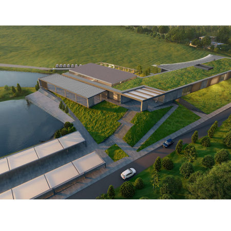Проєкт гольф-клубу вирізняється сучасною, елегантною естетикою з використанням природних матеріалів, таких як дерево, камінь і скло. Основний об’єм будівлі має вигнуту форму, що повторює лінії ландшафту і створює відкриту галерею з навісом для зон відпочинку та тренувань. Простір продуманий для комфорту гостей: великі панорамні вікна забезпечують візуальний зв’язок із навколишньою природою, а внутрішній дворик з озелененням додає приватності й затишку. Проєкт поєднує функціональність гольф-центру з естетикою сучасної архітектури, гармонійно вписуючись у природне середовище.