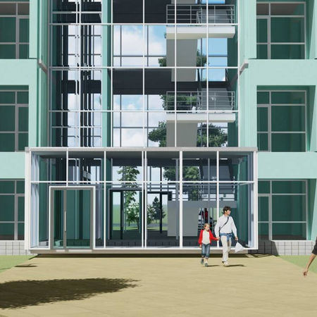 Замість 9 секцій одну секцію - великий вхідний вузол - великий вестибюль, зона рекреації, просторий, світлий, позитивний простір для спілкування та дозвілля мешканців будинку.