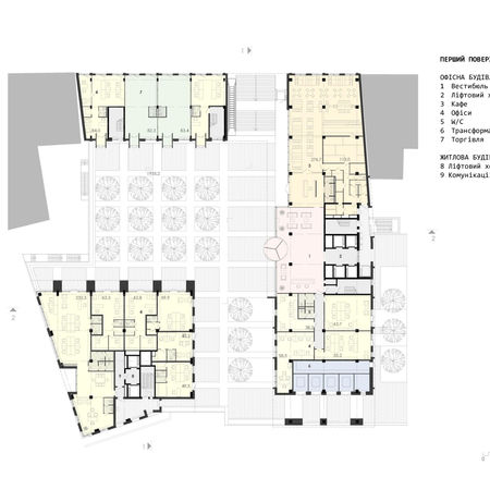 Офісна і житлова частина має відокремлені входи: офісна - з вулиці Шевченка через внутрішній двір, житлова - з існуючого провулка.